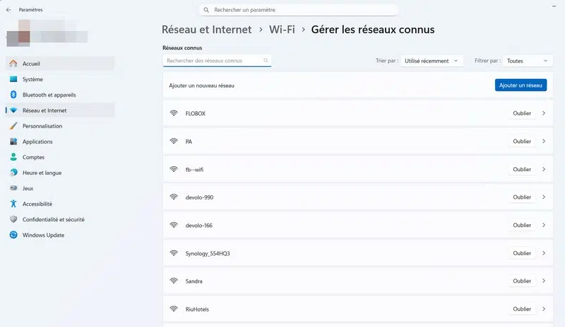 Sur Windows 11, vous pouvez aussi utiliser la nouvelle application Paramètres. Accédez à Paramètres > Réseau et Internet > Wi-Fi > Gérer les réseaux connus.