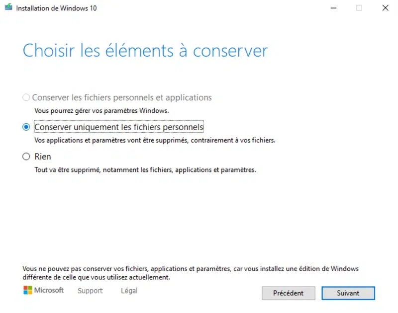 Ne lancez pas le programme d'installation maintenant, vous serez bloqué, à moins de réinstaller Windows ! Mais, dans ce cas, vous perdez vos applications (et dans certains cas, les fichiers aussi). C'est bien visible dans la liste des choix si vous tentez l'opération dès maintenant :