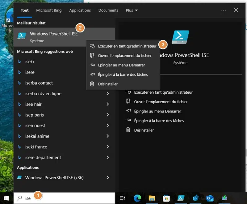 Pour effectuer les modifications via PowerShell, ouvrez l'application Windows PowerShell ISE sur votre machine, en tant qu'administrateur (via un clic droit). Cela peut fonctionner aussi directement avec un copier-coller dans une console PowerShell...