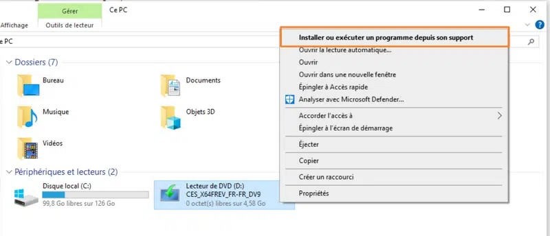 2. Un lecteur DVD virtuel sera visible dans la section "Ce PC" de l'Explorateur de fichiers. Effectuez un clic droit dessus, puis cliquez sur l'option "Installer ou exécuter un programme depuis son support".