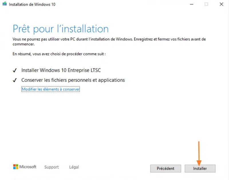 4. Quand vous arrivez à l'étape "Prêt pour l'installation", vérifiez que c'est bien précisé "Conserver les fichiers personnels et applications" avant de cliquer sur le bouton "Installer".