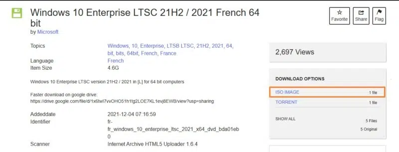Cliquez sur le lien "ISO IMAGE" à droite et patientez le temps du téléchargement. Vous obtenez un fichier nommé fr-fr_windows_10_enterprise_ltsc_2021_x64_dvd_bda01eb0.iso.