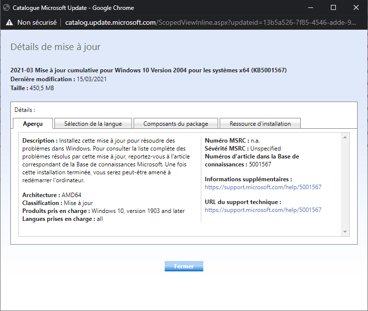 Il y a une autre manière de faire : se rendre directement sur le catalogue Microsoft pour télécharger soi-même la mise à jour et l'installer. Voici les liens en fonction des différentes versions de Windows et les noms de KB correspondants :