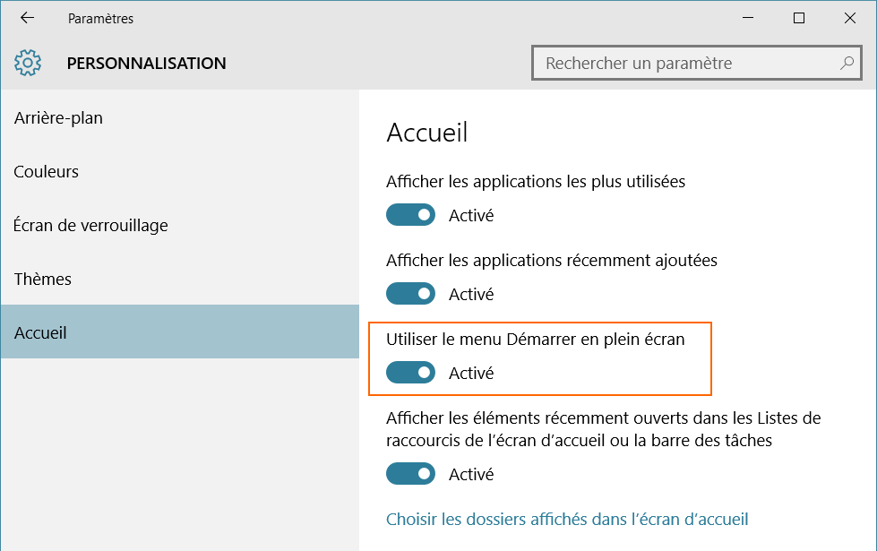 Le temps que l'on est dans ce panneau de configuration "Personnalisation", cliquez sur "Accueil" sur la gauche. Ensuite, si vous activez l'option "Utiliser le menu Démarrer en plein écran" vous retrouvez un menu Accueil à la Windows 8, plus stylisé. Il est à noter également la possibilité d'accéder à la liste de tous les programmes sous forme de barre latérale, plutôt que la liste bordélique que l'on avait sous Windows 8, ainsi que la présence continue de la barre des tâches.