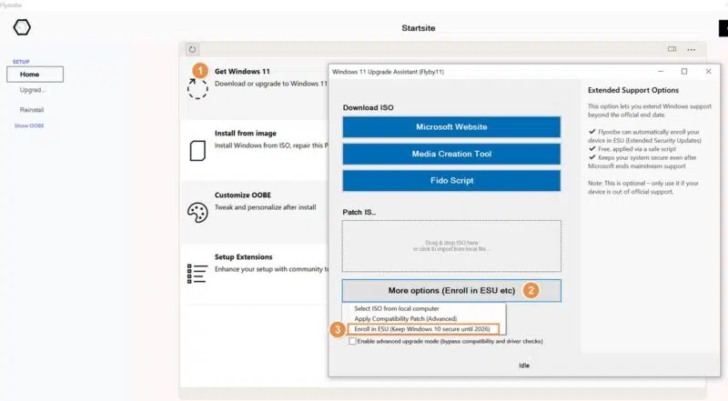 Dans Flyoobe, cliquez sur "Get Windows 11" puis cliquez sur le bouton "More options (Enroll in ESU etc)". Ensuite, choisissez l'option nommée "Enroll in ESU (Keep Windows 10 secure until 2026)".