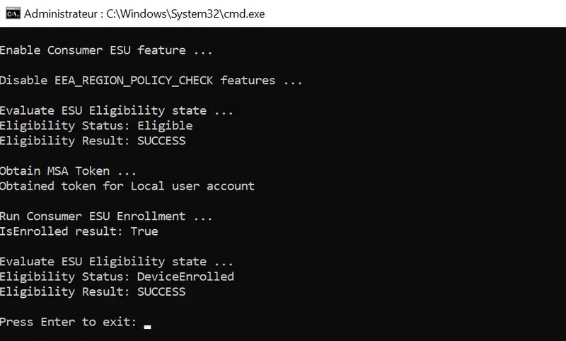 Dans le cas où vous êtes déterminé à le faire absolument maintenant, il existe encore une piste à explorer : le script Consumer ESU Enrollment. Il permet de forcer l'activation et l'inscription au programme ESU pour les particuliers, en utilisant différentes méthodes. Mais, attention, il n'active pas l'option dans Windows Update : il fait tout le processus à votre place et va inscrire votre machine. Il ne s'agit pas d'un script officiel proposé par Microsoft, mais d'une solution alternative.