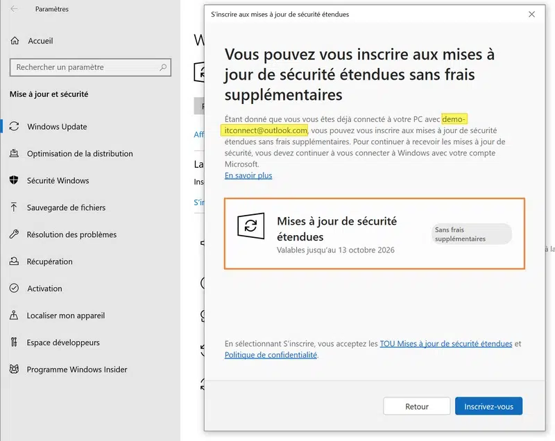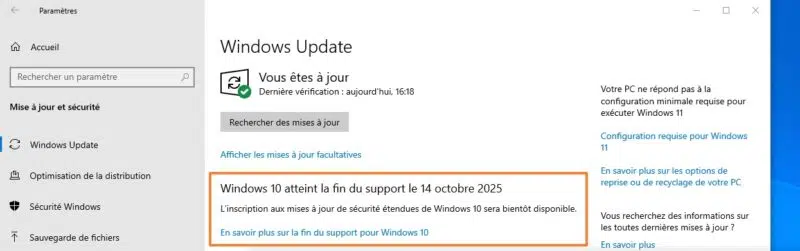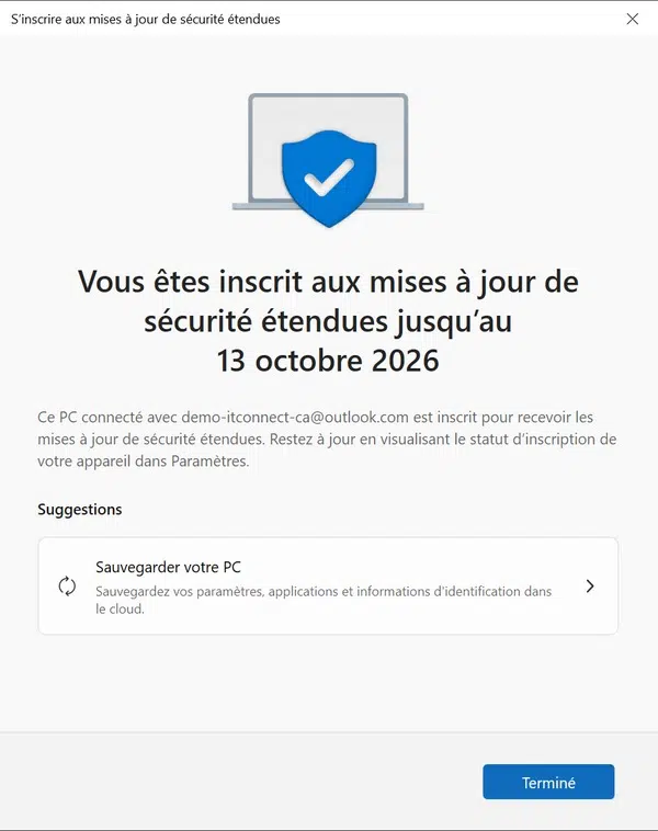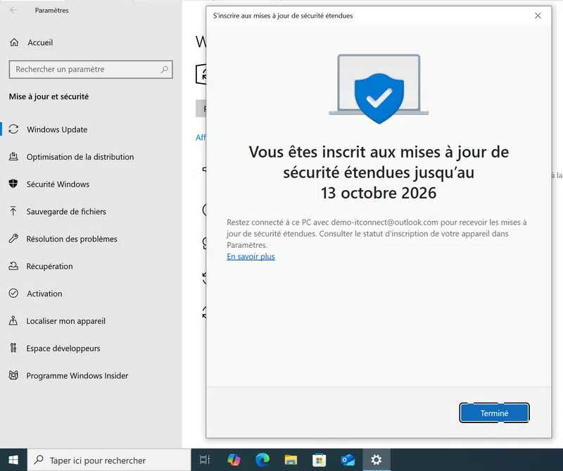 Au sein de Windows Update, un message discret confirme l'inscription : "Votre PC est inscrit pour recevoir les mises à jour de sécurité étendues."