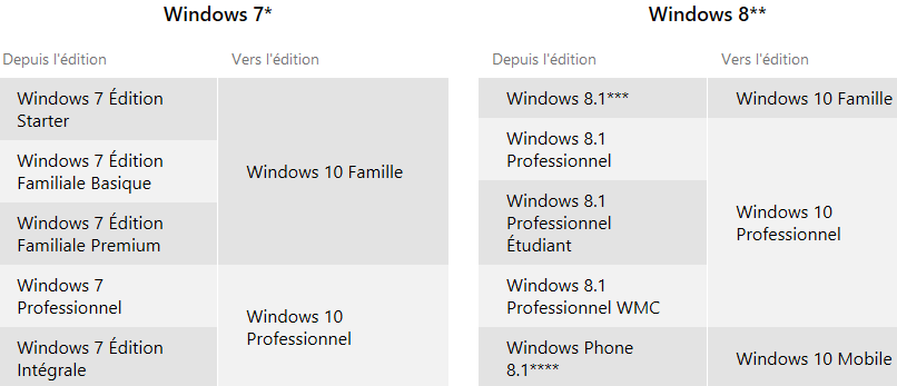 Pour rappel, voici un tableau récapitulatif sur les mises à niveau gratuites vers Windows 10, avec d'une part l'OS installé sur la machine, et d'autre part la version de Windows 10 obtenue grâce à la mise à niveau. Ceci pour Windows 7 et Windows 8.
