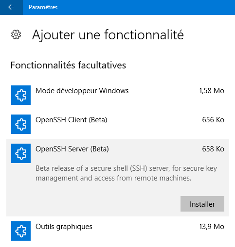 Procédure pour installer OpenSSH sous Windows 10 : Accueil > Applications > Applications et fonctionnalités > Gérer les fonctionnalités facultatives > Ajouter une fonctionnalité > OpenSSH Client et OpenSSH Server
