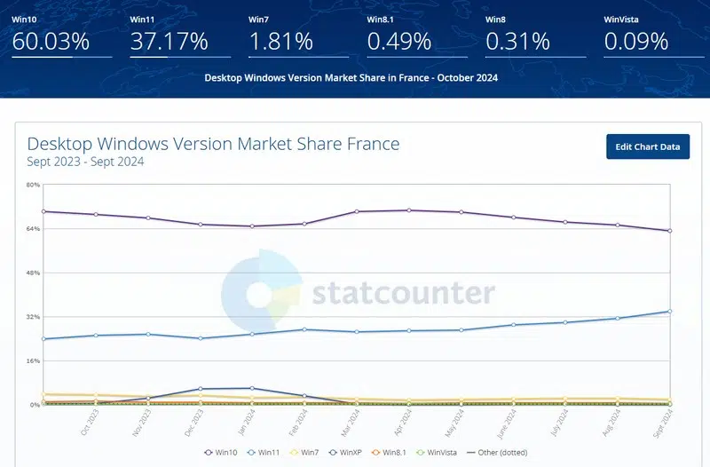 Si l'on se réfère au site StatCounter, on peut constater que Windows 10 est encore utilisé par 63.17% en France, tandis que 33.84% des utilisateurs ont une machine sous Windows 11. Même si les courbes finiront surement par s'inverser (à moins que Windows 12 entre en jeu), Windows 10 ne semble pas prêt de laisser sa place...