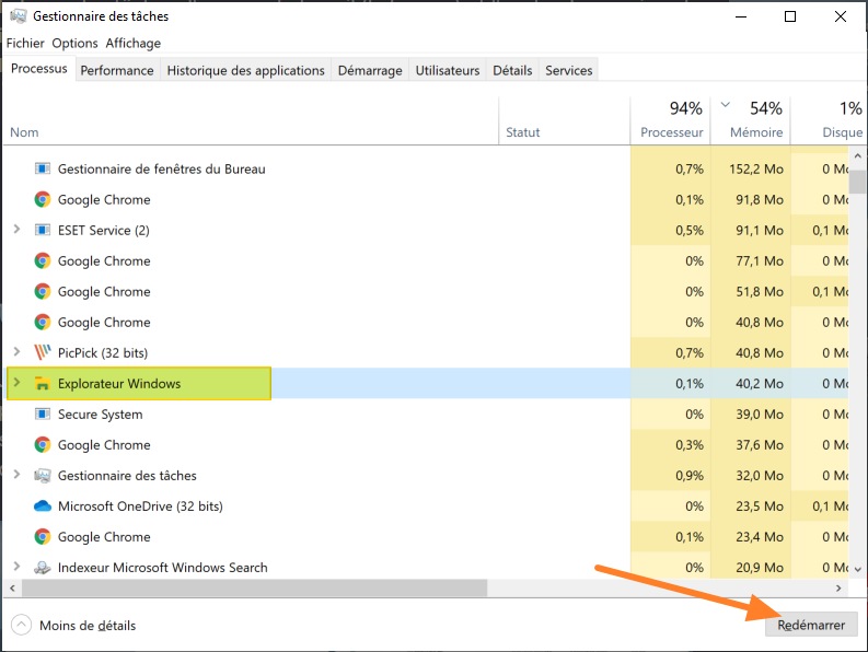 Pour rappel, si l'explorateur de fichiers plante, que la barre des tâches ne répond plus ou que le Bureau semble bloqué, vous pouvez redémarrer facilement le processus explorer.exe via le Gestionnaire des tâches.