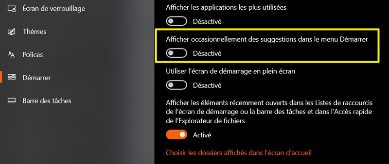 Heureusement, il est possible de masquer ces publicités en modifiant la configuration de Windows 10. Voici comment faire : accédez aux Paramètres, puis à la section "Personnalisation". Ensuite, sur la gauche cliquez sur "Démarrer" et désactivez l'option "Afficher occasionnellement des suggestions dans le menu Démarrer". Quoi qu'il en soit, je ne suis pas certain que les utilisateurs de Windows 10 apprécient...