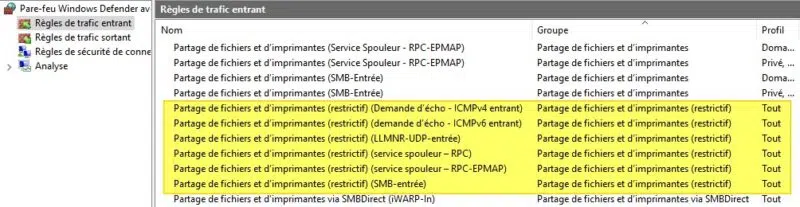 Avec Windows 11 24H2, le système ne va plus configurer automatiquement ce groupe de règles, mais un nouveau groupe nommé "Partage de fichiers et d’imprimantes (restrictif)". Ce nouveau groupe contient seulement 6 règles, contre 17 règles pour le groupe de règles "historique". Il contient un nombre plus restreint de règles afin de limiter les flux entrants (le NetBIOS est notamment exclu).