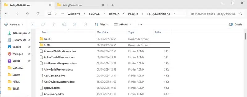 Prenez tous les fichiers ADMX et les dossiers nommés en-US et fr-fr, car il s'agit de fichiers de langue. Copiez-les dans le répertoire évoqué précédemment.
