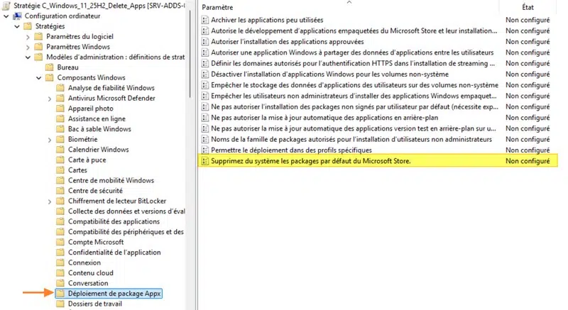 Ici, la stratégie de groupe suivante sera créée : C_Windows_11_25H2_Delete_Apps
