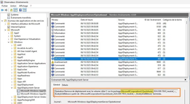 Par ailleurs, l'Observateur d'événements met en évidence des opérations de type "Remove" sur certains paquets. Quick Assist (Assistance Rapide), également ciblé par ma GPO, a été supprimé comme le montre le log ci-dessous. Ce journal est situé à l'emplacement suivant : Journaux des applications et des services > Microsoft > Windows > AppXDeployment-Server > Opérationnel.