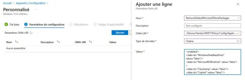 Microsoft précise qu'il est possible de faire sans ce paramètre, en utilisant un paramètre personnalisé et en ciblant le CSP RemoveDefaultMicrosoftStorePackages. Ce qui signifie que vous pouvez créer un nouveau profil de configuration Intune, de type "Modèles" puis "Personnalisez" afin de créer votre propre paramètre OMA-URI.