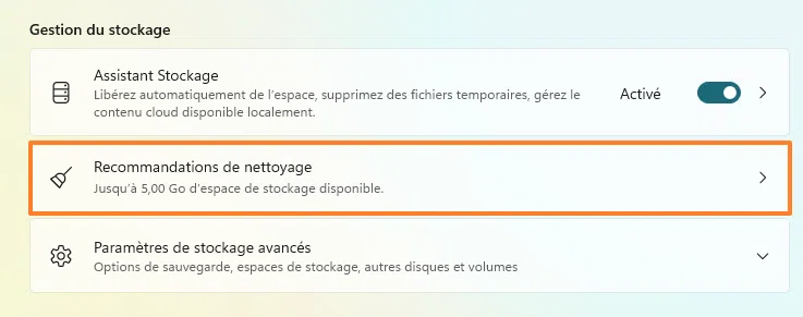 Un peu plus bas dans cette fenêtre, vous avez la "Gestion du stockage" avec une option intéressante, sur laquelle je vous invite à cliquer, qui s'appelle "Recommandations de nettoyage".
