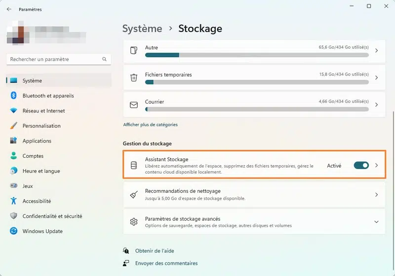 Toujours à partir de l'application "Paramètres", et de la section "Stockage" située sous "Système", vous pouvez accéder à l'Assistant Stockage.