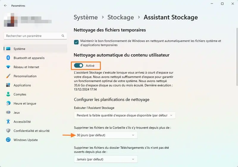 Il permet d'automatiser le nettoyage de la Corbeille de votre PC, ainsi que le dossier "Téléchargements" si vous le souhaitez (désactivé par défaut). Cela peut vous permettre de supprimer automatiquement les fichiers situés dans "Téléchargements" et qui n'ont pas été ouverts depuis 30 jours (ou une autre période allant de 1 jour à 60 jours).