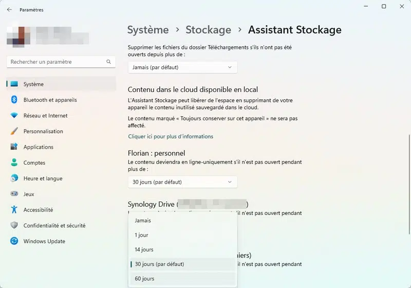 Lorsque vous utilisez OneDrive ou Synology Drive (d'autres Cloud sont surement pris en charge), vous avez accès à la fonctionnalité de "Fichiers à la demande" : le fichier est visible dans l'Explorateur de fichiers Windows, mais il est téléchargé en local que si vous l'ouvrez. Ainsi, l'Assistant Stockage est capable de supprimer la copie locale d'un fichier si celui-ci n'est pas ouvert depuis X jours. Le fichier sera alors disponible sur le Cloud, sans consommer d'espace disque sur votre PC.