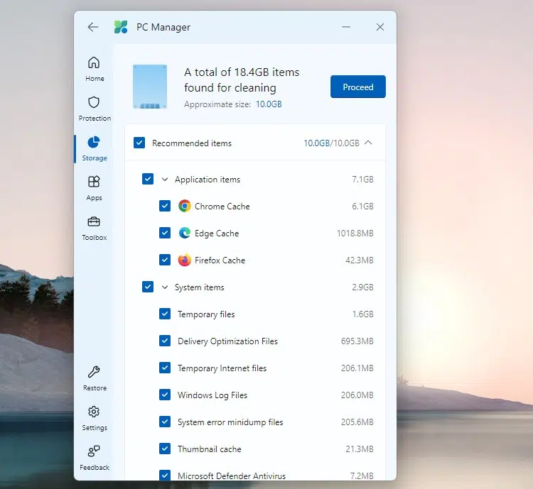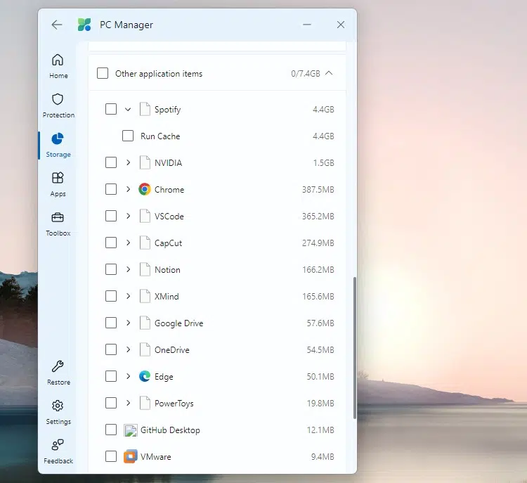 PC Manager va analyser votre disque en profondeur pour identifier les fichiers inutiles, ou en tout cas, les fichiers que vous pouvez supprimer et qui ne correspondent pas à des fichiers personnels. Par exemple, vous pouvez purger le cache des navigateurs : l'image ci-dessous met en avant un cache de 6.1 Go pour Google Chrome et 1 Go pour Microsoft Edge ! Voilà de quoi récupérer un peu plus de 7 Go.