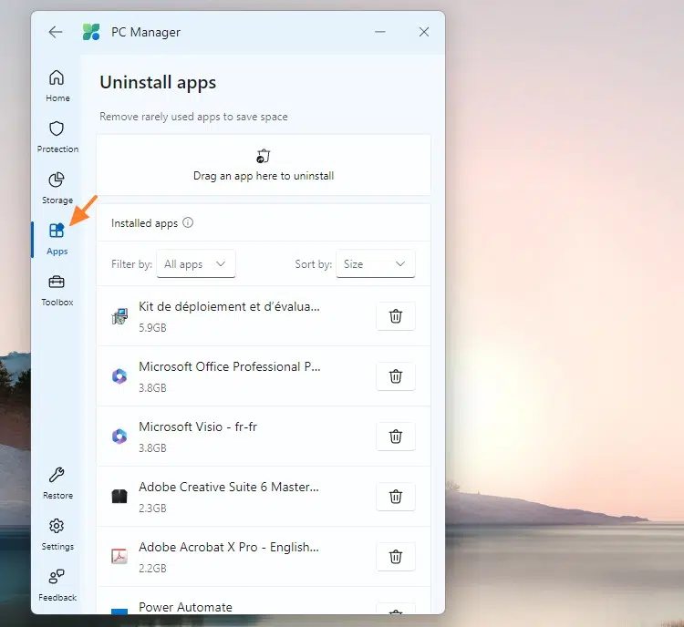 PC Manager dresse la liste des applications installées sur votre PC, par taille, c'est-à-dire de la plus gourmande en espace disque à l'application la plus légère. L'occasion, peut-être, d'identifier une ou plusieurs applications volumineuses et que vous n'utilisez plus. Pour supprimer une application, il suffit de cliquer sur l'icône corbeille au niveau de la ligne correspondante.