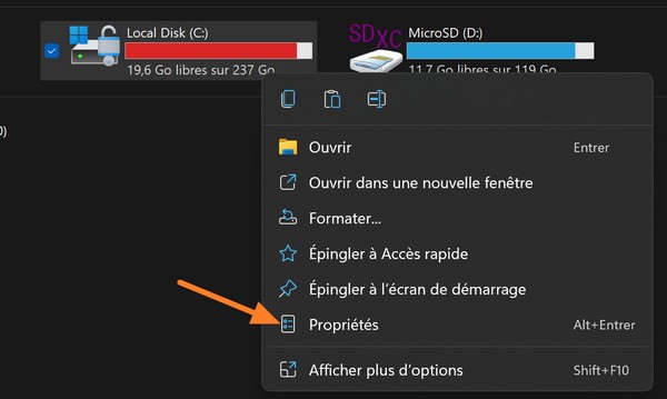 Commencez par ouvrir l'Explorateur de fichiers, puis sélectionnez le lecteur "C" où est installé Windows. Effectuez un clic droit dessus et cliquez sur "Propriétés".