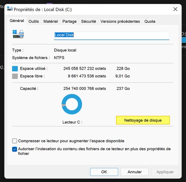 Au sein de l'onglet "Général", cliquez sur le bouton "Nettoyage de disque". Une autre fenêtre va apparaître.