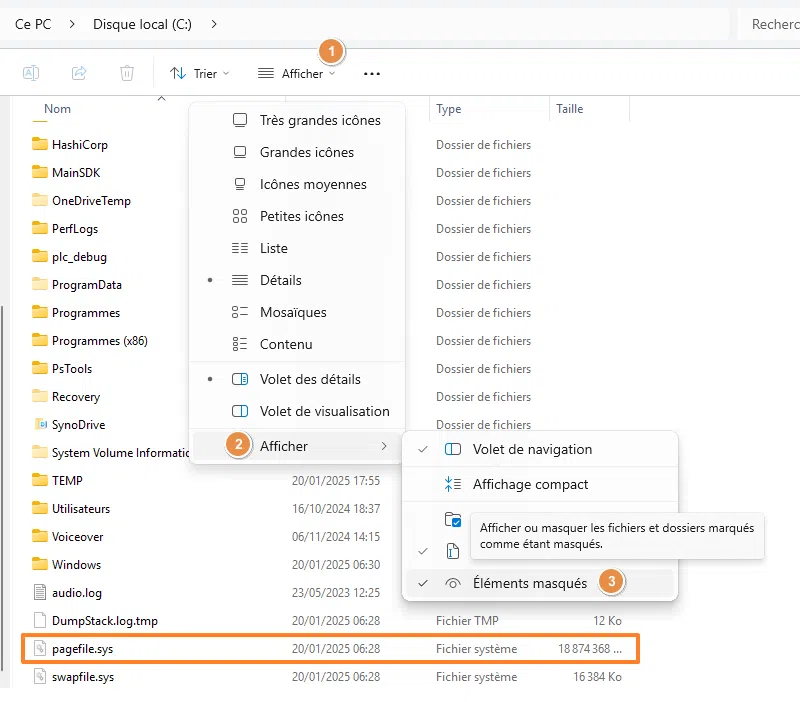 Le fichier pagefile.sys est situé à la racine du disque local "C" où est installé Windows. Il est masqué, donc vous devez effectuer quelques manipulations pour qu'il soit visible. Ce sera l'occasion de voir qu'il est bien là et de prendre connaissance de son poids, c'est tout.
