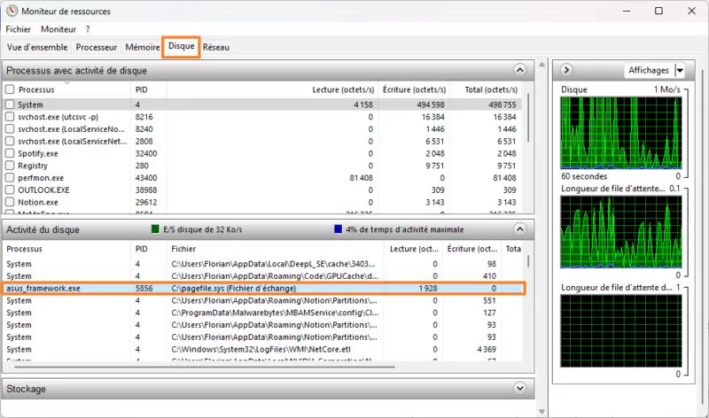 Si vous souhaitez en savoir plus sur les accès en temps réel à ce fichier, vous pouvez ouvrir le "Moniteur de ressources" sur votre PC. Il s'agit d'un outil intégré à Windows. Une fois qu'il est ouvert, cliquez sur l'onglet "Disque", et dans la section "Activité du disque", recherchez les accès sur le fichier "C:\pagefile.sys". Voici un exemple :