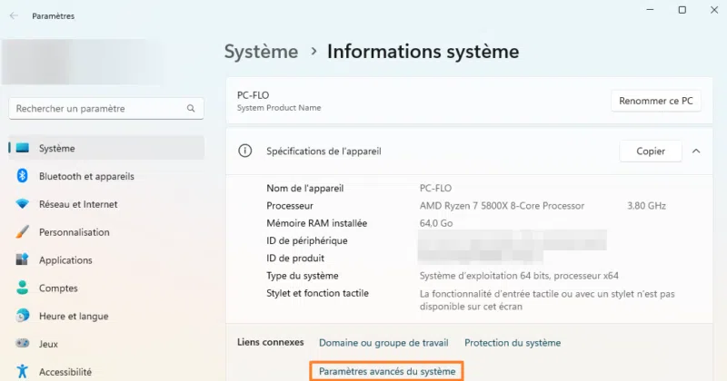 Pour ajuster la taille du fichier d’échange, accédez aux paramètres avancés du système. Ouvrez l'application "Paramètres", cliquez sur "Système" puis sur "Informations système". Ici, vous pouvez localiser un lien intitulé "Paramètres avancés du système". Cliquez dessus.