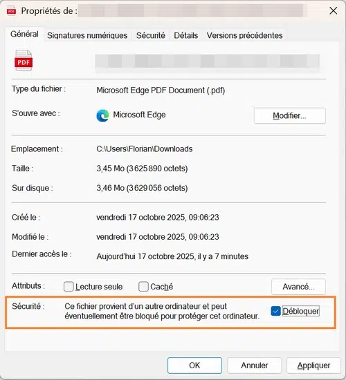En PowerShell, il est bien possible de débloquer un grand nombre de fichiers, mais il faut avouer que ce n'est pas pratique pour un utilisateur final. Et surtout, cela s'applique aux fichiers actuels, pas aux futurs. Par exemple, la commande ci-dessous sert à débloquer tous les fichiers PDF situés sous C:\Users\Florian\Downloads (session de l'utilisateur Florian).