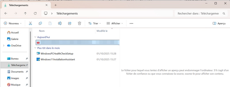 Suite à l'installation de cette mise à jour, si vous sélectionnez un fichier PDF, Word, Excel, etc... dans l'Explorateur de fichiers, ce dernier n'est plus capable d'afficher un aperçu du fichier. À la place, un message d'avertissement s'affiche : "Le fichier pour lequel vous tentez d'afficher un aperçu peut endommager l'ordinateur. S'il s'agit d'un fichier de confiance ou que vous connaissez la source, ouvrez-le pour afficher son contenu."