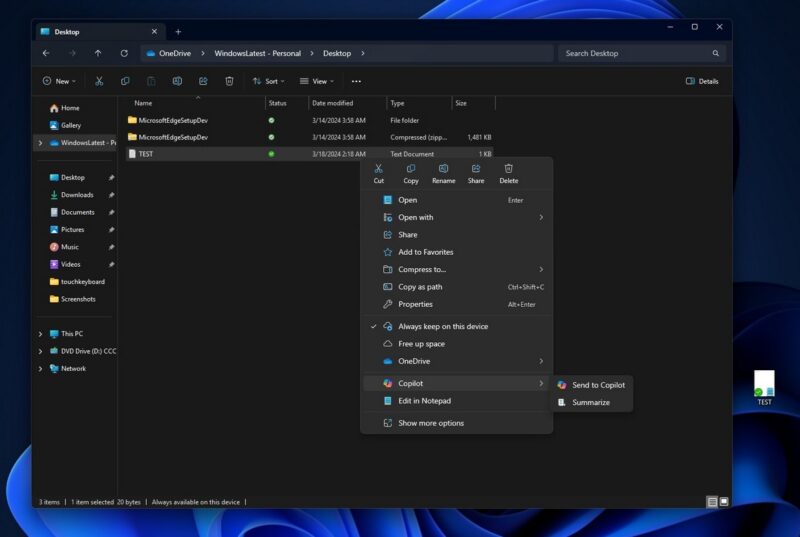 Au sein de Windows 11 Insider Preview Build 26080, dans laquelle Microsoft commence à tester une application unique pour Teams, un nouveau changement est également testé par l'entreprise américaine. En effet, Microsoft semble travailler sur l'intégration de Copilot directement dans l'Explorateur de fichiers de Windows 11, lorsque l'on effectue un clic droit pour faire apparaître le menu contextuel.
