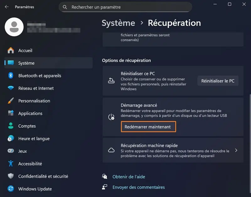 - Système > Récupération