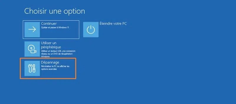 La machine redémarre immédiatement. Elle va afficher directement l'environnement de récupération de Windows, que l'on appelle aussi environnement WinRE. Sur cet écran, cliquez sur "Dépannage".