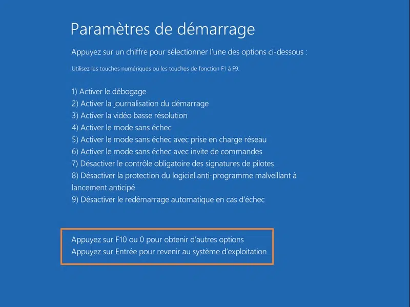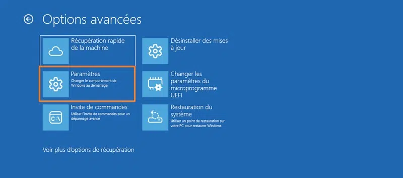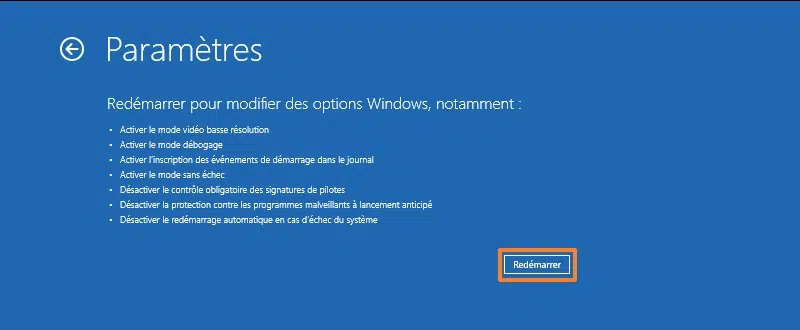 Éteignez complètement votre PC, puis allumez-le, et dès que Windows tente de démarrer, éteignez-le à nouveau. Effectuez cette manipulation 2 ou 3 fois, et il devrait basculer en mode de récupération. Suivez ensuite : Dépannage > Options avancées > Paramètres > Redémarrer.