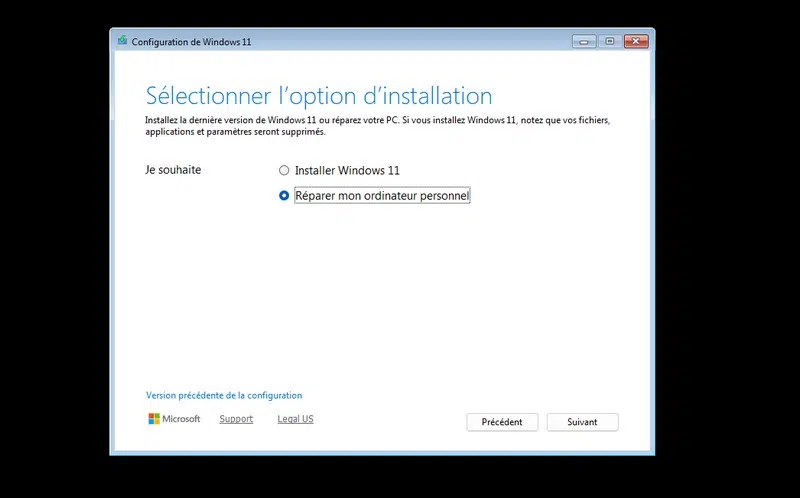 Passez les premières étapes... Ensuite, lorsque l’écran d’installation apparaît, choisissez l'option "Réparer mon ordinateur personnel".