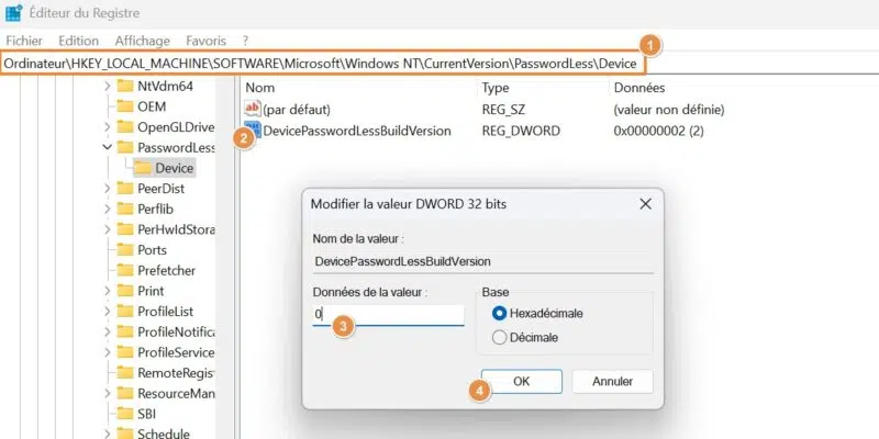 Vous devez configurer la valeur DevicePasswordLessBuildVersion à partir de l'Editeur du Registre (regedit) de Windows. Voici comment procéder :