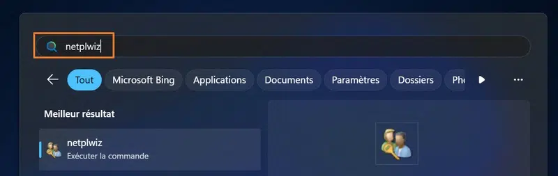 Commencez par accéder à la console de gestion des comptes utilisateurs, accessible via le raccourci netplwiz. Recherchez cette valeur dans le menu Démarrer ou la zone de recherche, et validez.