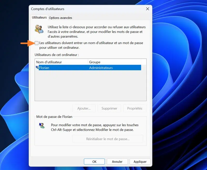 Dans la fenêtre Comptes d'utilisateurs, sélectionnez votre compte. Ici, nous prendrons l'exemple du compte nommé Florian. Ensuite, décochez la case "Les utilisateurs doivent entrer un nom d’utilisateur et un mot de passe pour utiliser cet ordinateur", puis cliquez sur le bouton Appliquer.