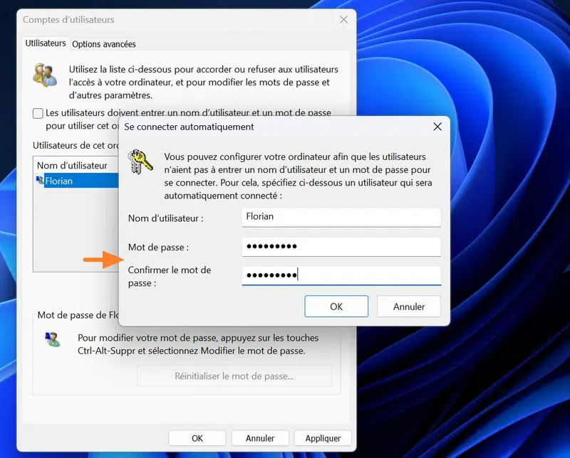Une nouvelle fenêtre apparaît : saisissez le mot de passe du compte par deux fois pour confirmer. Cliquez sur OK, puis redémarrez votre ordinateur pour tester votre configuration !