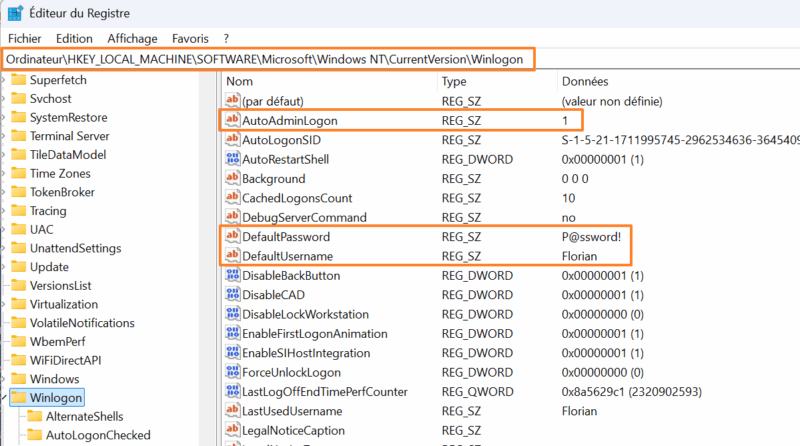 Note : avec cette méthode, le mot de passe n'est pas stocké directement dans le Registre, bien qu'il configure les valeurs évoquées précédemment (à l'exception du mot de passe).
