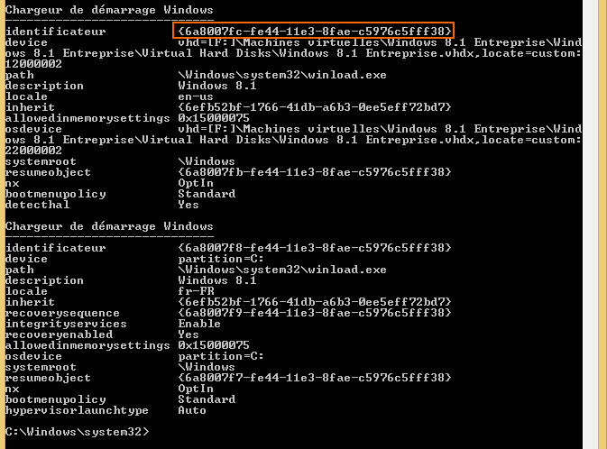 Repérez l'identificateur correspondant à l'entrée du VHDX dans le magasin BCD. Sélectionnez et copiez cet identificateur.