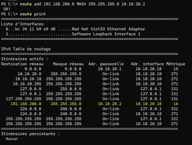 À ce stade, la route est bien ajoutée mais elle n’est pas persistante ! Autrement dit, si vous redémarrez l'ordinateur, elle sera effacée ! Ça peut être utile pour effectuer un test rapide, mais pas pour du long terme.