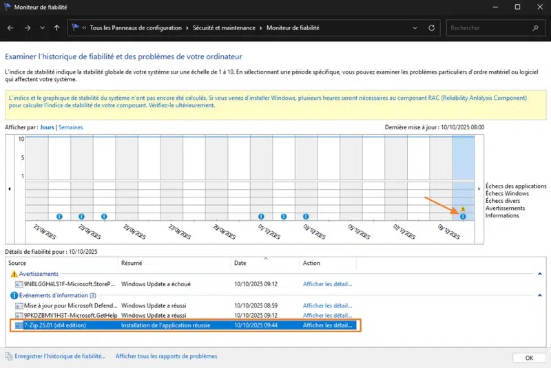 Sur Windows, le Moniteur de fiabilité est un outil graphique qui fournit une vue chronologique de la stabilité du système et des événements qui l'affectent, comme les erreurs système, les installations de mises à jour ou de logiciels. Même si son historique est limité à 1 mois, il peut être utile si vous recherchez des informations sur un événement récent.