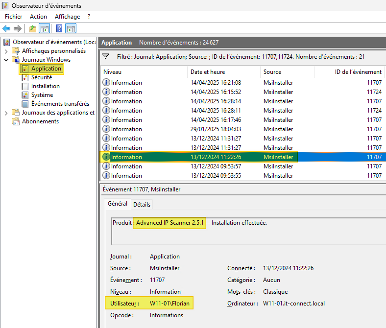 Lorsque des applications classiques sont installées ou supprimées à l’aide d’un installeur MSI sur Windows (même certains EXE peuvent utiliser un MSI packagé), le système enregistre automatiquement des événements dans le journal "Application" de l’Observateur d’événements. Ces événements sont générés par le service MsiInstaller. On peut les retrouver via ces ID :