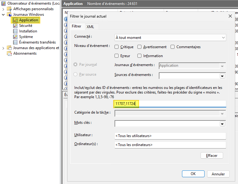 Effectuez un clic droit sur le nom du journal et cliquez sur "Filtrer le journal actuel...". Une fenêtre apparaît. Renseignez les identifiants d’événements suivants dans le champ ID de l'événement : 11707,11724. Il est possible d'en préciser d'autres, le tout étant de séparer les ID par une virgule. Cliquez sur OK pour valider.