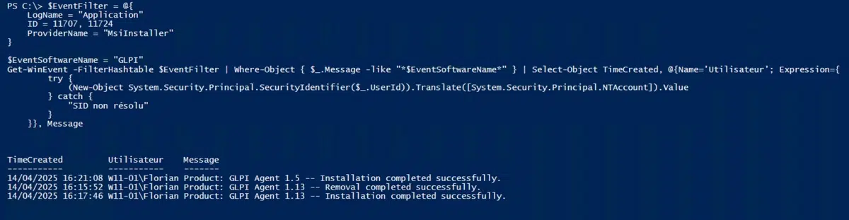 Get-WinEvent -FilterHashtable $EventFilter | Where-Object { $_.Message -like "*$EventSoftwareName*" } | Select-Object TimeCreated, @{Name='Utilisateur'; Expression={